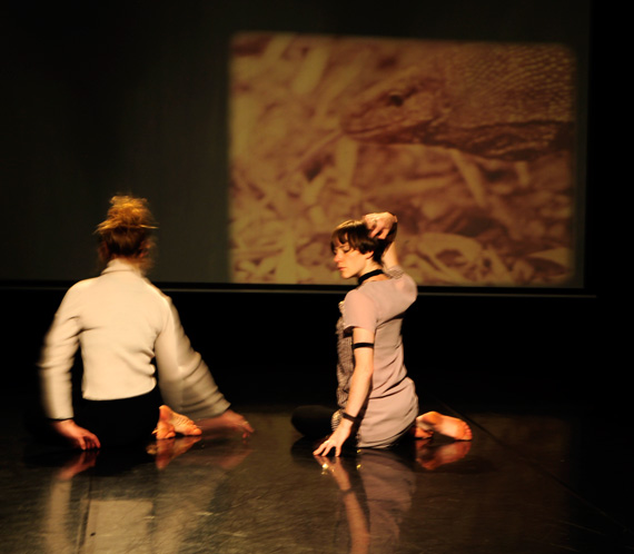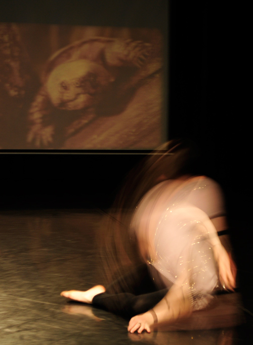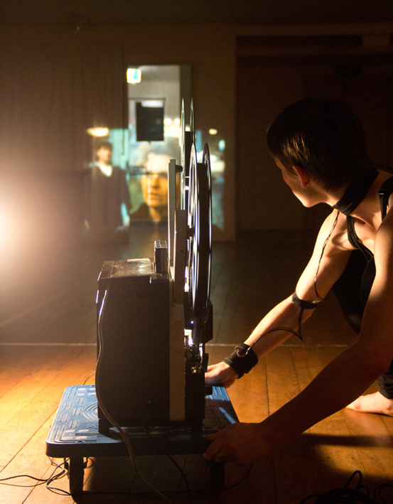 Film Series #1 is a performance for two dancers and two re-engineered interactive 16mm projectors. The dancers control the speed of the film projectors, which allows them to progress the story through their movements. Both film and sound are manipulated in real-time, accompanied by a rich sound track and the vivid mechanic utterings of the film projectors. What has been abandoned in the wake of progress? Controlling hybrid sense-machines two performers experiment with recovering and playing film scenes. In the era of the ceaseless upgrade, their nostalgic longings lead them to discover a new sense of purpose in the abandoned practice of the projectionist as they replay, unwind and sound its ‘magic’. What matters for us in this work is the creation of a performance environment where the textures, weight, rhythms and sounds of the celluloid era are remixed with the extended potentials of the digital through wearable technology, to create a resonant, poetic and magical experience for audiences.