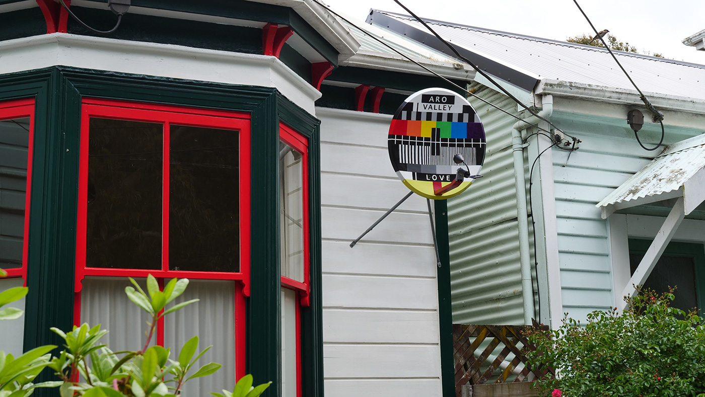 Obsolete satellite dish painted with acrylic and retrofitted with a solar light, which automatically switches on at night.