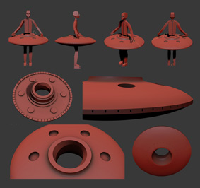 First there was the idea, then a moodboard/concept. The images are all sourced from the net and collaged together to express the general idea: As a form-finding exercise I sanded foam into a small flying saucer model. Then Ian Loh created the 3D plans with my guidance.