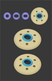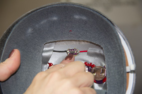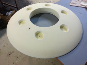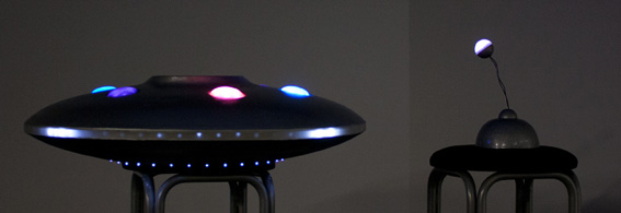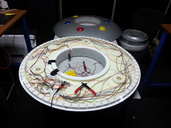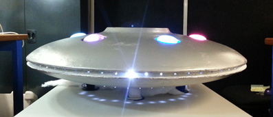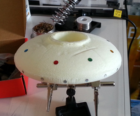 I vaccum-formed the covers for the top lights of the saucer out of clear plastic and the spray-painted them. After various experiments with the colours of the saucer top lights I decided on a colour scheme.